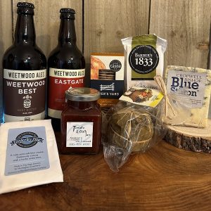 Weetwood Ale of which there are two varieties, a generous jar of locally made chutney, biscuits for cheese of which there is a whole packet! and a fig ball which is super interesting.. squished figs wrapped in vine leaves makes a perfect pairing with cheese.. he will love this.